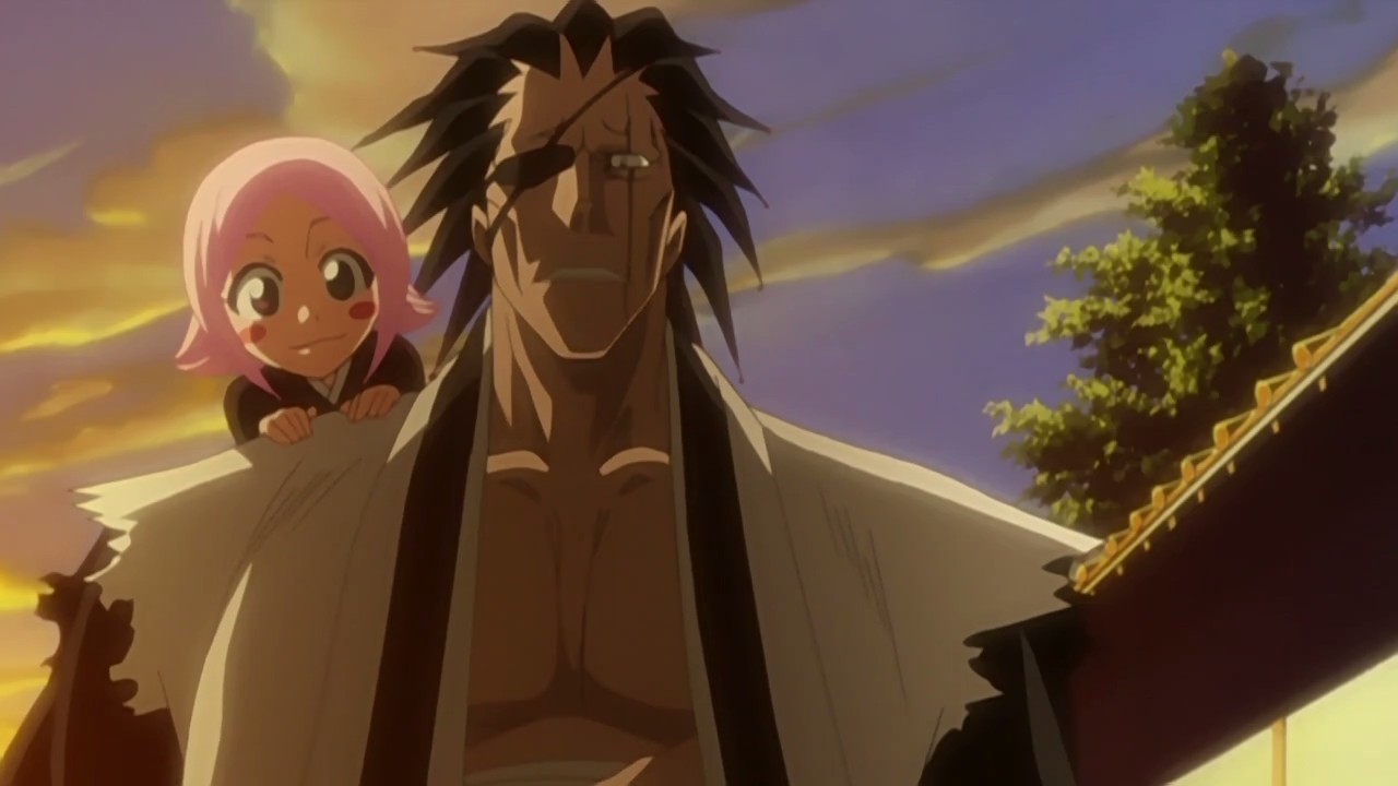 ós a luta com Ichigo e desde então se tornou um tapa-olho preto normal com alças normais. Ele tem olhos verdes, pronunciadas arcadas superciliares, sem pelos, e uma enorme cicatriz correndo pelo lado esquerdo de seu rosto, que ele ganhou antes de encontrar sua futura tenente,Yachiru Kusajishi. Ele também é um dos mais altos Shinigamis, com 202 centímetros (cerca de 6 pés e 6 polegadas), tornando-o um pouco mais alto que Yasutora Sado e quase o dobro da altura de sua tenente. Sua estatura é muitas vezes exagerada até mesmo para propósitos dramáticos, especialmente em contraste com a Yachiru